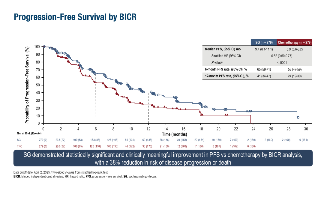 △图1.在ASCENT-03试验中,对于既往未经治疗的晚期TNBC,与化疗相比,戈沙妥珠单抗在PFS方面显示出显著改善(ESMO 2025年会,LBA20)