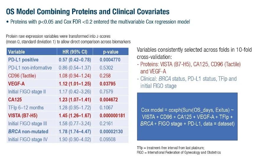 图:在一个结合了蛋白质和临床变量的多变量模型中,VISTA、CA125、VEGF-A和CD96对于较差的OS仍然具有显著性。