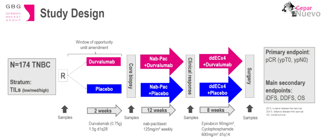 GeparNuevo研究入组人群为经中心病理证实的三阴性乳腺癌,cT1b-cT4a-d肿瘤,按1∶1随机分组,试验组为度伐利尤单抗联合白蛋白紫杉醇周疗续贯剂量密集EC新辅助化疗,对照组为安慰剂联合同样的新辅助化疗方案。试验组度伐利尤单抗仅在新辅助治疗阶段应用,在辅助治疗不再使用。预设分层为患者的肿瘤基质浸润性淋巴细胞(sTILs)的水平,>10%为高水平,<10%为低水平。