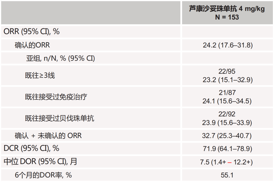 • 中位持续缓解时间(DOR)为9.3个月,两个剂量组分别为9.3个月和8.7个月;