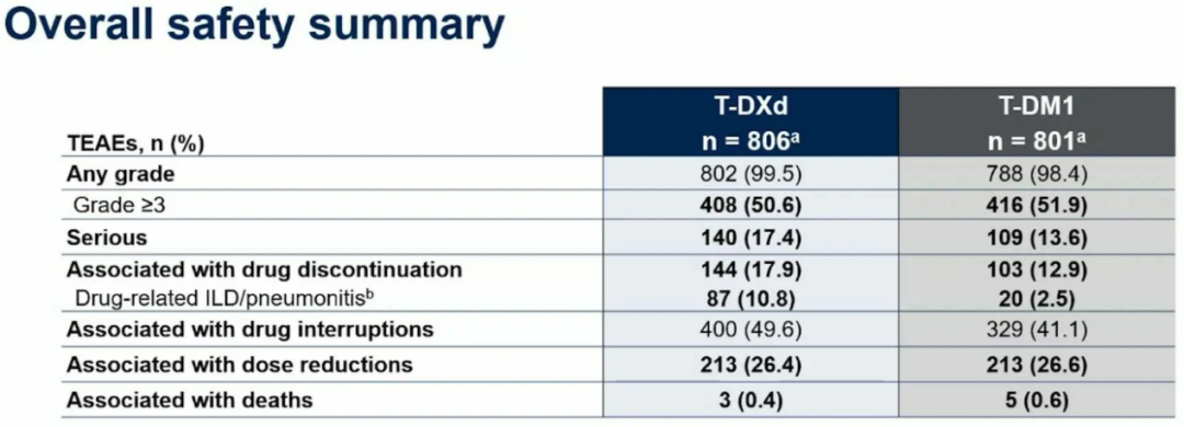 安全性方面,T-DXd在研究中的安全性特征与其已知的安全性特征一致,本次期中分析时未发现新的安全性问题;T-DXd组和T-DM1组≥3级TEAE的发生率相近(50.6%/51.9%),两组的治疗相关ILD/非感染性肺炎发生率均较低(9.6%/1.6%),且大多数ILD/非感染性肺炎事件均为低级别(1-2级),及时监测和处理下均可控。
