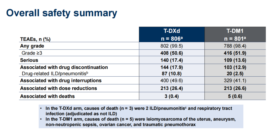 安全性方面,T-DXd组与T-DM1组的≥3级不良事件发生率相当(50.6%vs 51.9%)。