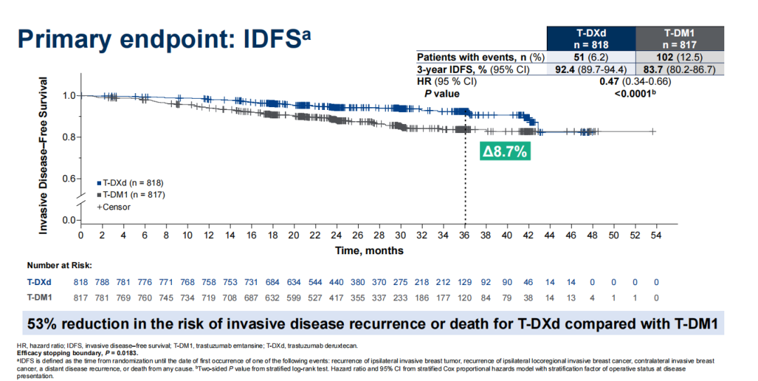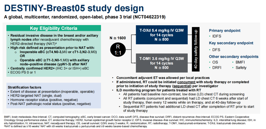DB-05研究是一项全球多中心、随机、开放标签的III期临床试验,旨在评估T-DXd与T-DM1在高危HER2阳性早期接受新辅助治疗后仍有残留浸润病灶的患者辅助治疗中的疗效与安全性。研究共入组了1600多例患者,按1:1随机分配接受T-DXd或T-DM1治疗。主要终点为无浸润性疾病生存期(IDFS),关键次要终点为无病生存期(DFS),其他次要终点包括OS、无远处复发间期(DRFI)、无脑转移复发间期(BMFI)和安全性。