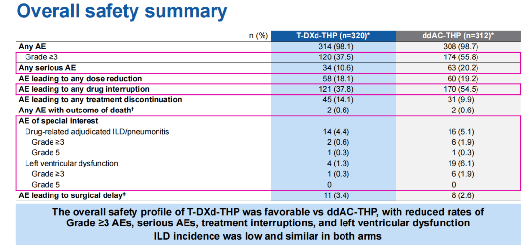 安全性方面,T-DXd-THP vs ddAC-THP≥3级不良事件发生比例分别为37.5%和55.8%,由于AE导致的治疗终断比例分别为37.8%和54.5%,在血液学毒性以及心脏毒性方面T-DXd-THP也更具优势。而临床医生关注的间质性肺病/非感染性肺炎(ILD/p)发生率较低,T-DXd-THP≥3级发生率低于对照组(0.6%vs 1.9%)。