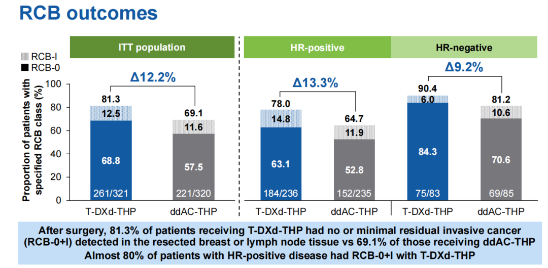 更值得注意的是,T-DXd-THP组高达81.3%的患者达到了残留癌症负荷0-1级(RCB 0-1),即几乎为无瘤状态,相较于ddAC-THP组(69.1%)提高了12.2%;HR+和HR-亚组也分别提高13.3%和9.2%,显示了显著的肿瘤退缩效果。