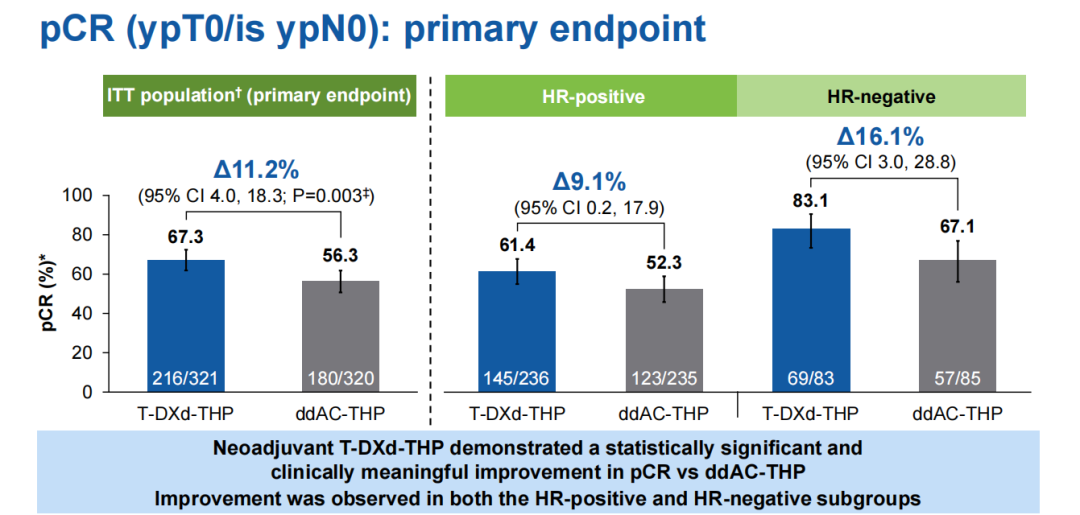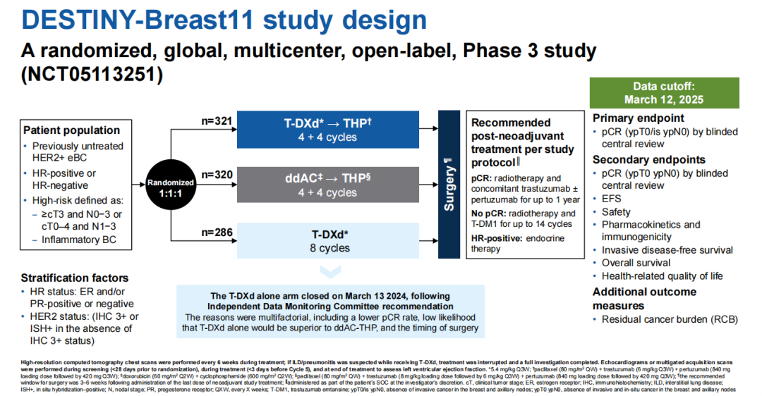 DB-11是一项全球多中心、随机、开放性III期研究,旨在评估T-DXd(5.4 mg/kg)单药或T-DXd序贯紫杉醇、曲妥珠单抗和帕妥珠单抗(THP)作为新辅助治疗与标准治疗方案相比在高风险(淋巴结阳性[N1-3]或原发肿瘤分期T3-4期)、局部晚期或炎性HER2阳性早期乳腺癌患者中的疗效和安全性。研究共设置了三个治疗臂:ArmA T-DXd单药组(N=286):8周期T-DXd;ArmB T-DXd-THP组(N=321):4周期T-DXd治疗后,序贯4周期THP;ArmC ddAC-THP组(N=320):4周期剂量密集多柔比星+环磷酰胺(ddAC)后,序贯4周期THP(传统标准方案);并根据患者的HR状态和HER2状态进行了分层,主要终点是pCR率(BICR)。次要终点包括无时间生存期(EFS)、总生存期(OS)和安全性等。