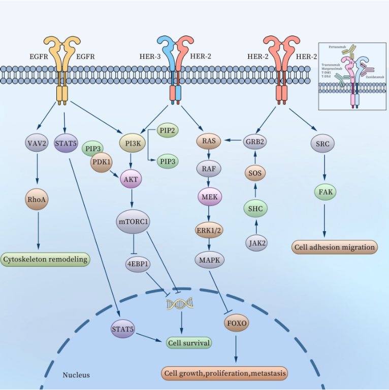 HER2本身无配体结合能力,需通过形成同源或异源二聚体(如HER2-HER3、EGFR-HER2)激活下游信号通路,包括RAS-MEK-MAPK、PI3K-AKT、SRC-FAK等,调控细胞增殖、迁移、凋亡等过程。HER2-HER3异源二聚体被认为是最强的信号激活组合。