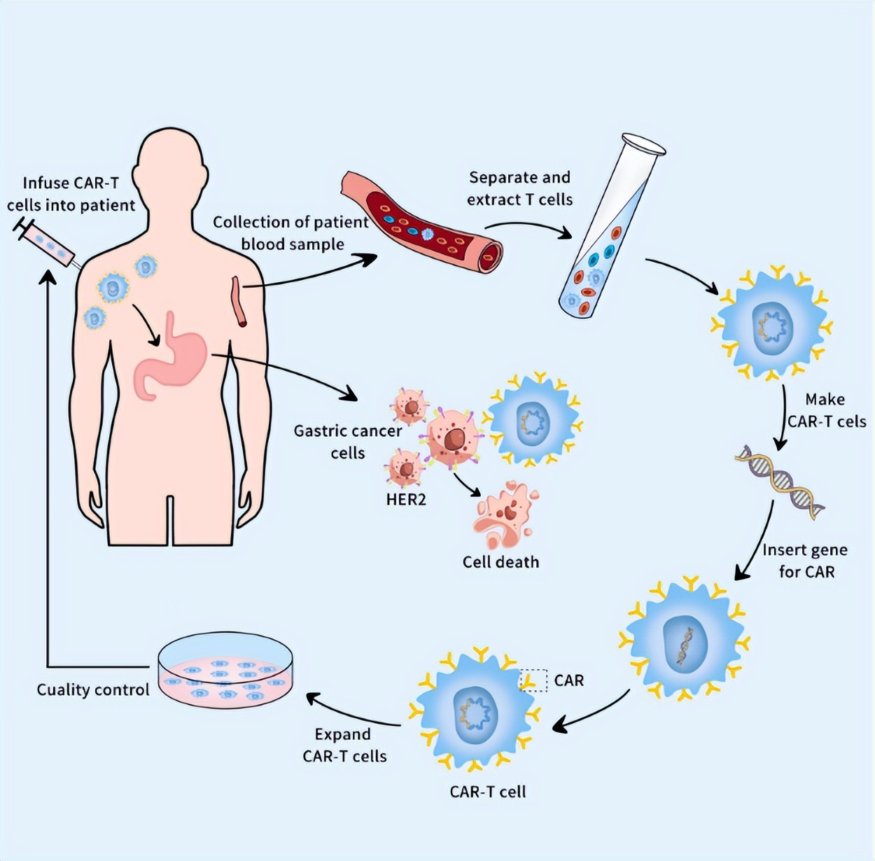 目前,CAR-T细胞疗法在治疗B淋巴细胞白血病和B细胞非霍奇金淋巴瘤等血液系统恶性肿瘤方面取得了显著成功。近年来,其在治疗实体瘤方面的潜在疗效也得到认可。在HER2阳性胃癌治疗中,HER2抗原特异性激活的扩增CAR-T细胞能有效清除患者体内的HER2阳性胃癌细胞,提高治疗效果和预后(图3)。