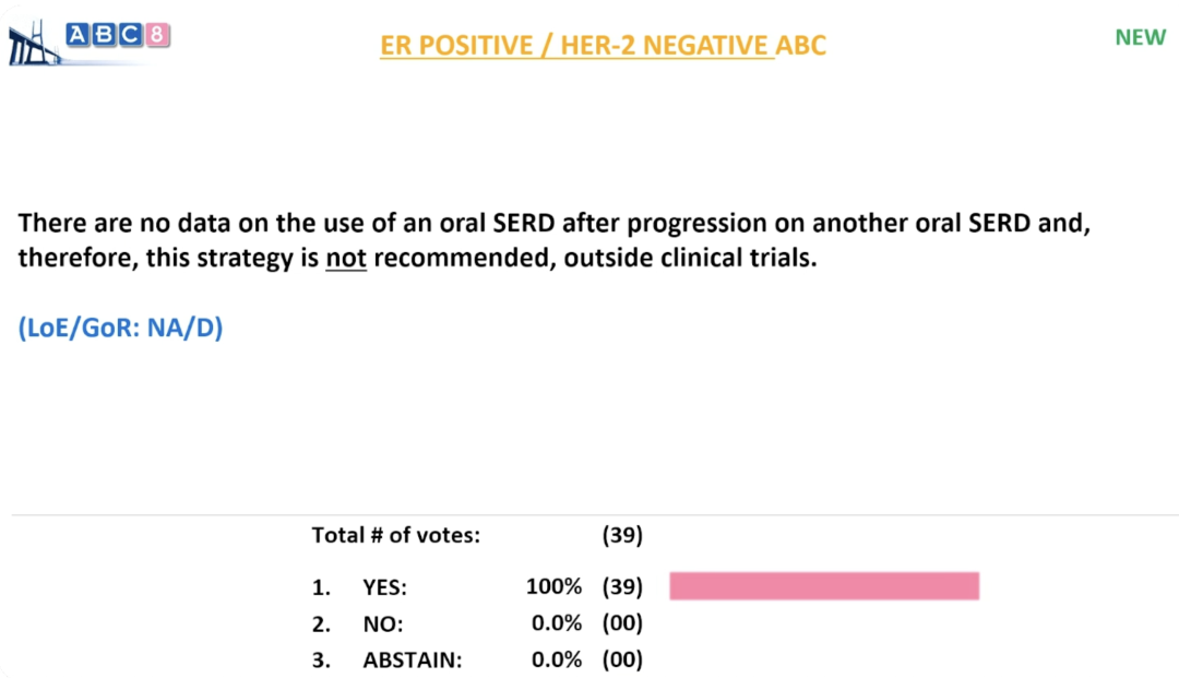 目前尚无数据支持在一种口服SERD治疗进展后换用另一种口服SERD,因此,在临床试验之外不推荐采用该策略。