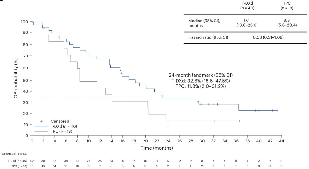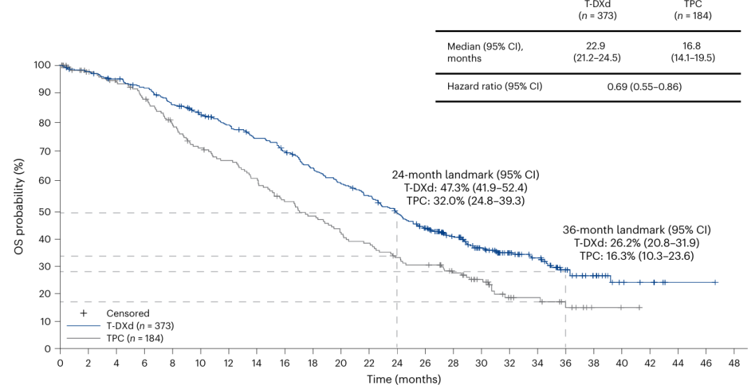 OS结果与主要分析结果一致,T-DXd组中位OS为22.9个月(vs.TPC组16.8个月;HR 0.69,95%CI 0.55-0.86)。在HR+队列中,T-DXd组的中位OS为23.9个月(vs.TPC组17.6个月;HR 0.69,95%CI 0.55–0.87)。在HR-队列中,T-DXd组的中位OS为17.1个月(vs.TPC组为8.3个月;HR 0.58,95%CI 0.31-1.08)。T-DXd组的24个月OS率是TPC组的2倍以上(分别为32.6%和11.8%)。