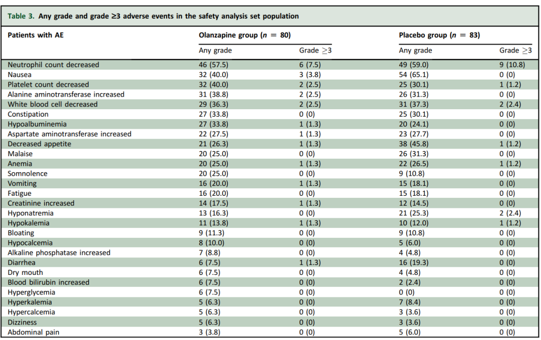 在经历恶心或呕吐的患者中,奥氮平组的中位首次恶心发生时间较对照组延后(6.5天vs 3.0天),首次发生呕吐的中位时间则在两组均未达到。对于出现恶心或呕吐的患者,奥氮平组的中位症状持续日数明显少于安慰剂组(恶心:4天vs.8天,呕吐:2天vs.4天),提示奥氮平不仅降低了症状发生率,也缩短了症状持续时间,同时奥氮平组患者使用挽救性药物的比例也较低(38.8%vs.56.6%)。患者报告结局(PROs)分析显示,食欲减退在奥氮平组发生率较低,且对日常活动的干扰较小;腹泻症状的报告频率在奥氮平组同样低于对照组。