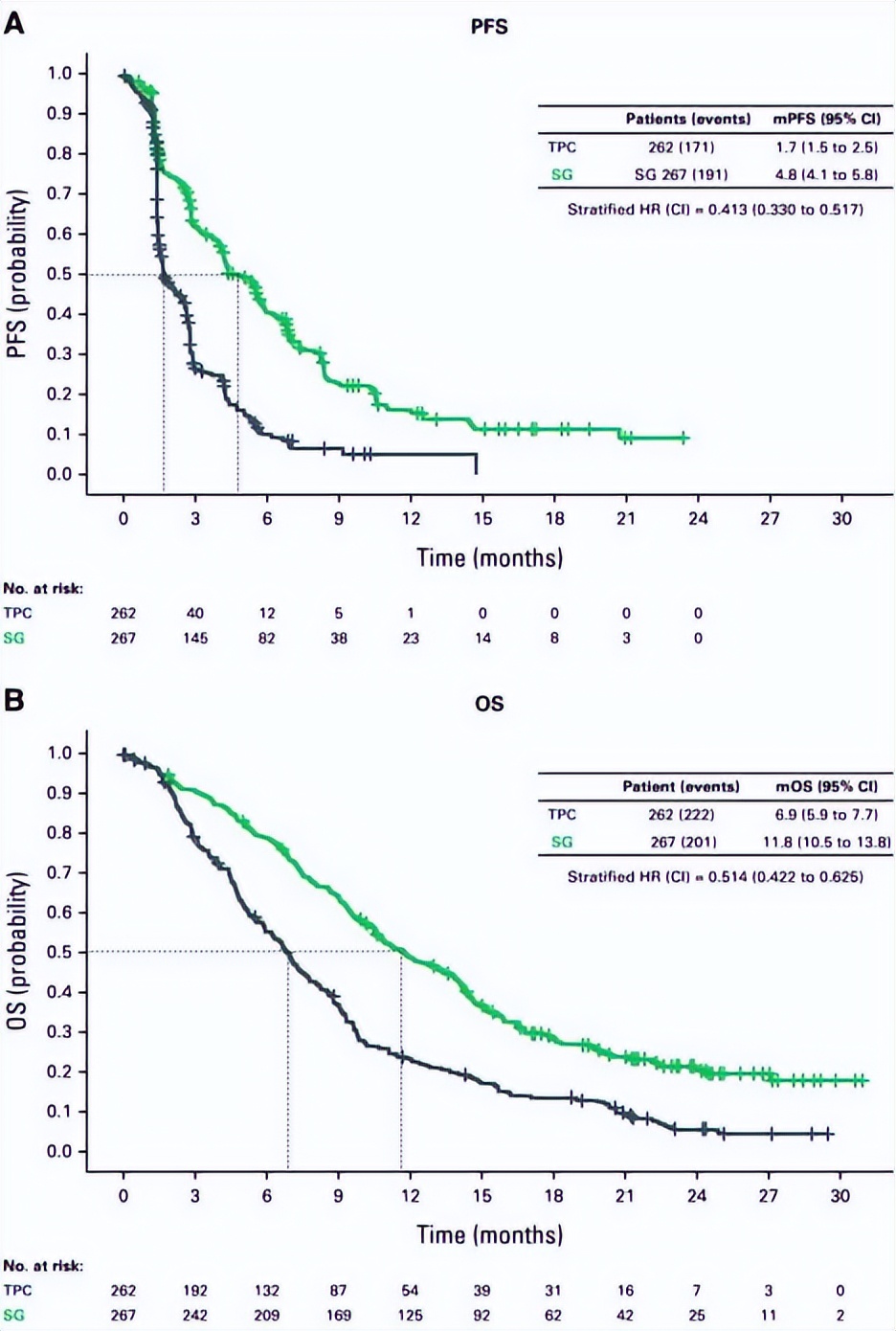 目前戈沙妥珠单抗已经国内外广泛应用,并取得了一系列真实世界研究结果。美国一项真实世界研究回顾了230例使用戈沙妥珠单抗作为二线及以上治疗的TNBC患者数据,结果显示,戈沙妥珠单抗作为二线治疗时中位真实世界总生存期(rwOS)为13.9个月,24个月rwOS率为32%;作为三线治疗时,中位rwOS为8.4个月,24个月rwOS率为20%[15]。意大利的SARELIFE研究纳入了27家中心121例患者,戈沙妥珠单抗中位3线治疗TNBC的mOS为14.1个月[16]。西班牙的SACISUR研究纳则入了159例TNBC患者,使用戈沙妥珠单抗单药中位4线治疗的mOS为10.5个月[17]