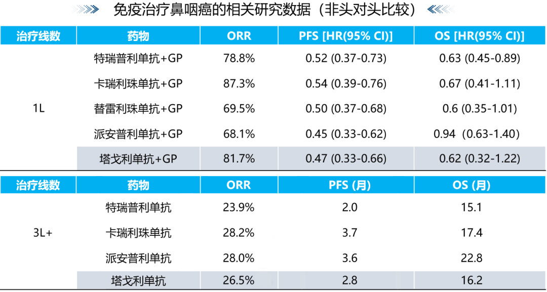 目前而言,以塔戈利单抗为代表的免疫治疗,为复发或转移性鼻咽癌的全程管理提供了新的治疗选择。在疗效上,塔戈利单抗无论是联合化疗用于一线治疗,还是作为后线单药治疗,均能有效改善患者的生存预后。可以说,其疗效媲美于现有的PD-1免疫检查点抑制剂[8-16]