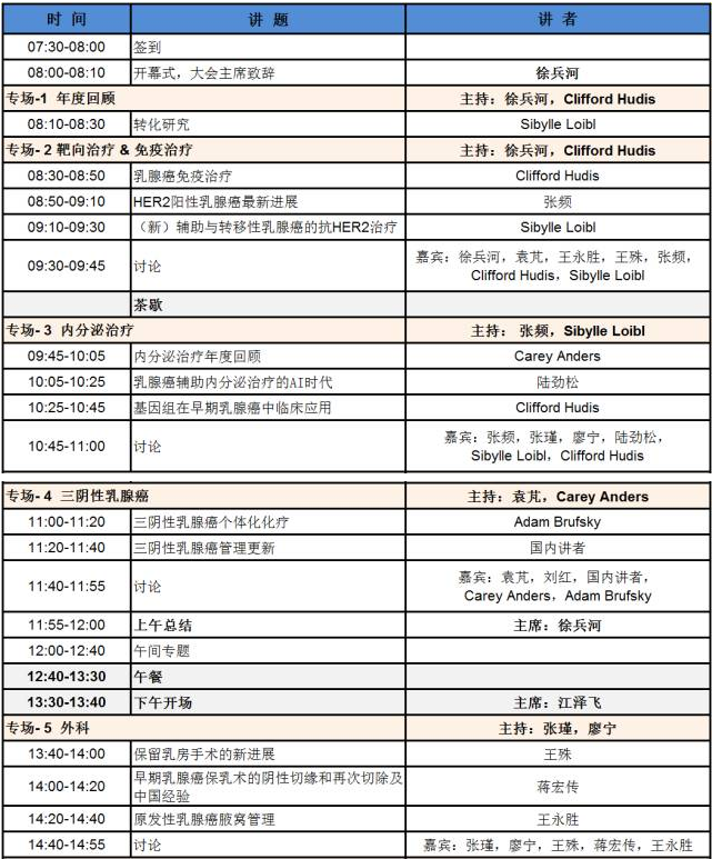 拓宽视野汲取国际会议营养、发展我国乳腺癌抗击事业是一代代医务工作者义不容辞的责任。本届会议将有北京、上海两个会场,北京会场的议题有转化研究、免疫治疗、内分泌治疗、三阴性乳腺癌、乳腺外科等乳腺癌领域热点问题。会议已邀请到美国纪念斯隆-凯特林癌症中心Clifford Hudis教授、德国乳腺癌组织(GBG)Sibylle Loibl教授、北卡罗来纳大学教堂山分校综合癌症中心Carey Anders教授、匹兹堡大学医学院Adam Brufsky教授,国内专家也将分享各自领域的相关工作经验。