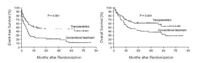 对于PTCL患者,移植前CR是通过ASCT获得长生存的关键。美国MD Anderson癌症中心(Beitinjaneh A, et al.Biol Blood Marrow Transplant 2015; 21(5): 855-859)的一项回顾性研究显示,ASCT作为一线巩固方案治疗PTCL的4年OS为76%,PFS为56%,移植前CR的患者4年OS高达84%,PFS则达到61%。Corradini等(Corradini P, et al. Leukemia 2006;20(9):1533-1538)的研究也发现移植前是否达到CR与10年OS和EFS均强烈相关,移植前达到CR的患者10年EFS为62%,而未达到者仅为10%。北京协和医院的回顾性研究通过多因素分析显示移植前未达CR是预后不良的独立危险因素,移植前CR者5年OS为81%,而PR者仅为59.3%(P=0.006)。虽然缺乏充足的证据,但多数研究主张在PTCL患者在诱导化疗获得CR后进行一线自体移植。