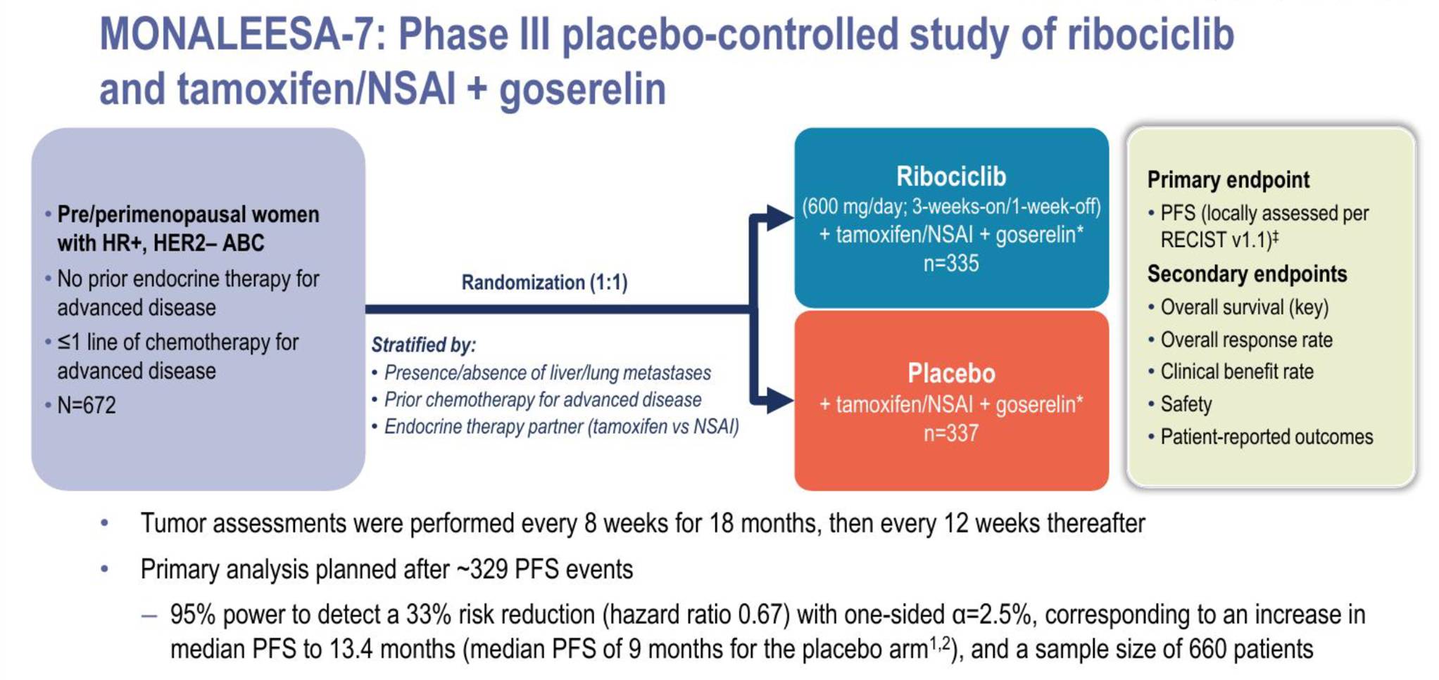 研究共入组晚期患者672例,1:1随机分配进入Ribociclib组(n=335)或安慰剂组(n=337),两组均以他莫昔芬(20 mg/d)+OFS或NSAI(来曲唑2.5mg/d,阿那曲唑1mg/d)+OFS为基础用药。分层因素包括:肺转移或肝转移、既往治疗、内分泌联合药物类型。