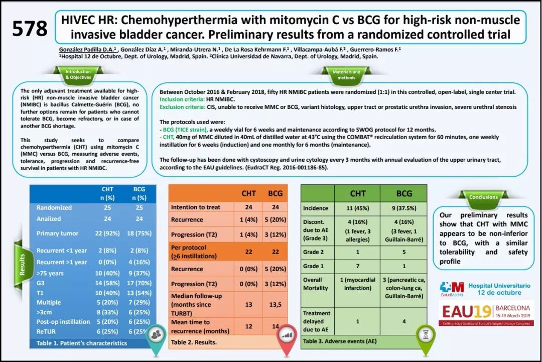 2. EAU19最佳壁报 :HIVEC HR :高危非肌层浸润性膀胱癌丝裂霉素C热灌注化疗与BCG: 随机对照试验的初步结果