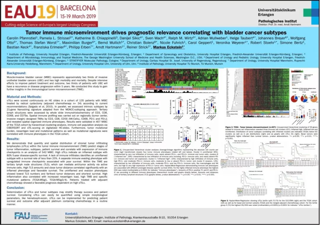 肌肉浸润性膀胱癌(MIBC)约占侵袭性尿路上皮癌(UBC)的三分之二并具有高发病率和死亡率。三分之二的UBC患者会在5年内复发或疾病进展。来自德国Friedrich-Alexander Universit?t?Erlangen-Nürnberg大学的一项研究,应用135例全膀胱切除术(辅助化疗n = 34)的MIBC标本对基质肿瘤浸润淋巴细胞(sTIL)进行研究,407例TCGA数据库病例用以验证。结果证明了肿瘤免疫微环境(TIME)中sTILs的空间分布及数量可以预测肿瘤炎症、亚型、患者存活和免疫检查点的表达。高sTIL提示一种80% 5年DFS的炎症表型,而非炎症表型DFS则小于25%。免疫检查点上调的免疫逃避表型与生存不良相关。炎症表型有着良好生存并且与大量临近肿瘤的三级淋巴结结构(TLS)相关。非炎症表型和免疫逃避表型则预后较差且表现为低数量且远离肿瘤的TLS。高炎症还与新抗原负荷增加、高TMB和特异性突变模式(TCGA-MSig1,TCGA-MSig3 / 4)相关。高sTILs患者辅助化疗效果好。这部分结果表明sTILs和肿瘤亚型检测可以用于预测MIBC患者疗效和生存。