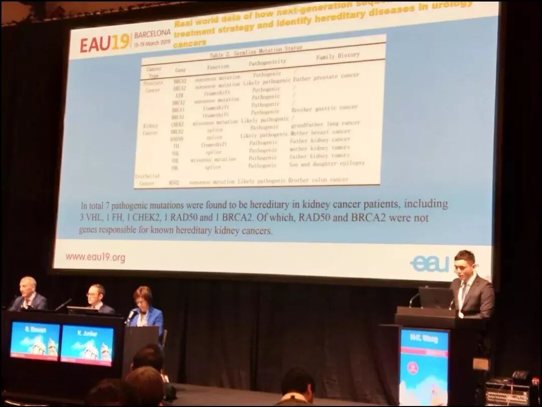 1. 王弘恺医生公布了叶定伟教授团队真实世界下泌尿系统肿瘤基因突变结果初步汇报,研究纳入了行基因突变检测的患者217名,均来自于真实世界NGS的临床应用,其中141例患者接受了胚系突变检测,76例患者接受了体系突变检测。前列腺癌150例,肾癌57例,膀胱癌10例。根据基因检测结果给予患者遗传咨询及治疗指导。根据后续随访,基因检测可能直接或者间接改变了20%患者的治疗。通过真实世界的数据看到了二代测序技术在泌尿系统肿瘤中的应用已崭露头角,能够帮助我们为部分晚期患者寻找可能的治疗靶点,并有助于发现遗传性泌尿系统疾病。