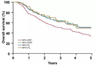 讨论: 数据显示HPV阳性的患者较阴性的患者具有更佳的预后,因此其可能成为T4a LSCC的预后标志物。HPV阴性患者接受CRT治疗的预后显著较其他患者差,提示这部分患者不适宜选用CRT进行治疗。本研究中检索的患者数据并未披露HPV的检测方法,因此不同医院之间检测方法有可能不同。HPV定量分析及不同亚型HPV分析可能会有更进一步的结果。