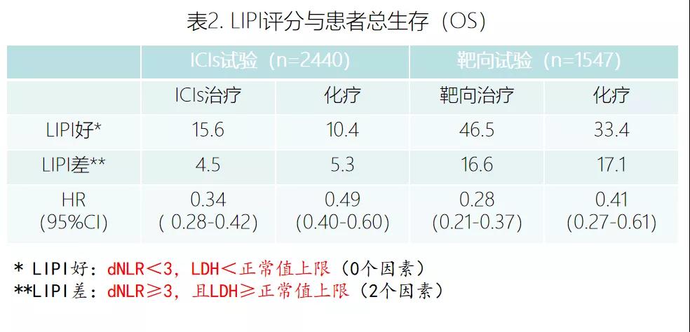 dNLR(中性粒细胞数/ [白细胞数-中性粒细胞数])、LDH(乳酸脱氢酶)与免疫检查点抑制剂(ICIs)治疗黑色素瘤的疗效有关,但与肺癌的关系还不明确。2018年2月,Laura Mezquita 等发表在JAMA oncology的一项研究中,回顾分析了欧洲8个中心的晚期NSCLC数据显示,dNLR≥3和LDH≥正常值上限是患者生存的独立预后因素(HR2.22,HR2.51)。作者进一步提出了肺免疫预后指数(Lung Immune Prognostic Index,LIPI)评分,并证实LIPI与晚期NSCLC接受ICIs治疗的生存预后和疾病控制呈相关性。但该研究中的化疗对照组未发现LIPI与疗效相关。
