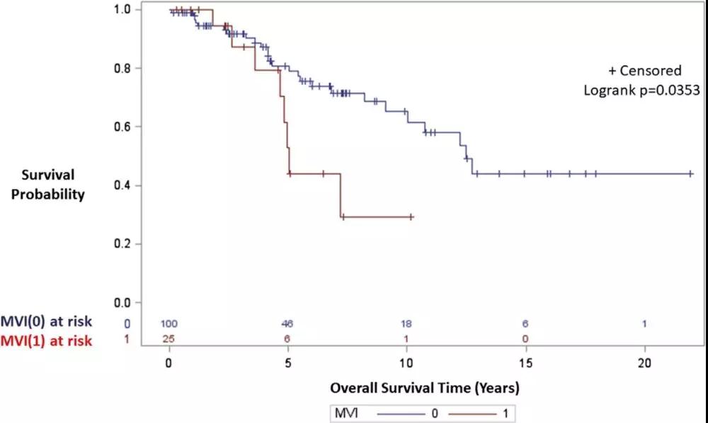 图2 伴随(1)和无(0)MVI的PNETs患者的总生存期对比