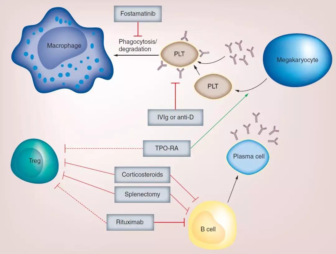 ITP是一种获得性自身免疫性出血疾病,约占出血性疾病总数的1/3.成人的年发病率为5~10/10万,育龄期女性发病率高于同年龄组男性,60岁以上老年人是该病的高发群体。临床表现以皮肤黏膜出血为主,严重者可发生内脏出血,甚至颅内出血,出血风险随年龄增长而增加。该病主要机制是由于机体内免疫功能异常(包括B细胞功能异常、T细胞功能异常、血小板生成异常或巨噬细胞异常激活)导致的免疫介导的血小板破坏增多和巨核细胞产生血小板不足所致1。