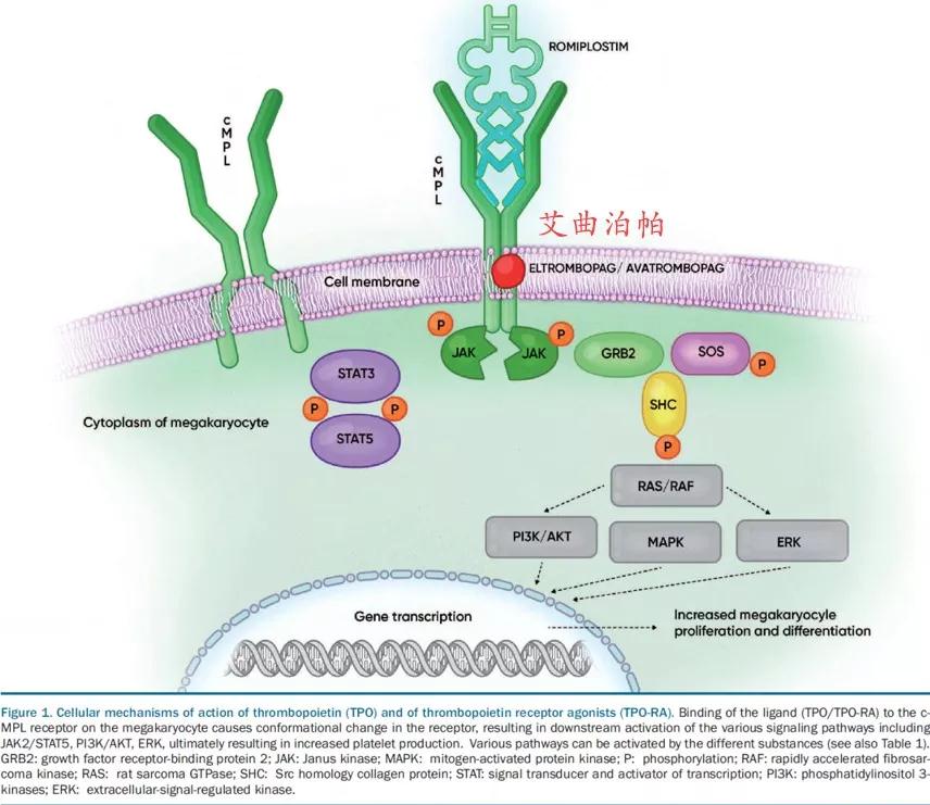 艾曲泊帕乙醇胺片(瑞弗兰®)是我国唯一的非肽类口服 TPO 受体激动剂,它可以与细胞膜上的 TPO 受体(跨膜区)结合,激活信号转导通路,刺激人类骨髓祖细胞向巨核细胞的分化和增殖,促进巨核细胞成熟,从而增加血小板的生成。其不同于糖皮质激素的促进血小板生成机制可以快速将血小板水平升至安全水平;多个研究一致显示,瑞弗兰治疗后,30%左右的ITP患者可获得停药后长期缓解4,5;艾曲泊帕乙醇胺片与内源性 TPO 的作用位点不同,不会与内源性 TPO 竞争受体,不会诱导TPO抗体,可以实现稳定和可预测的血小板计数上升;相较传统rhTPO的注射用药模式,口服用药方式大大增加了依从性和舒适度6。
