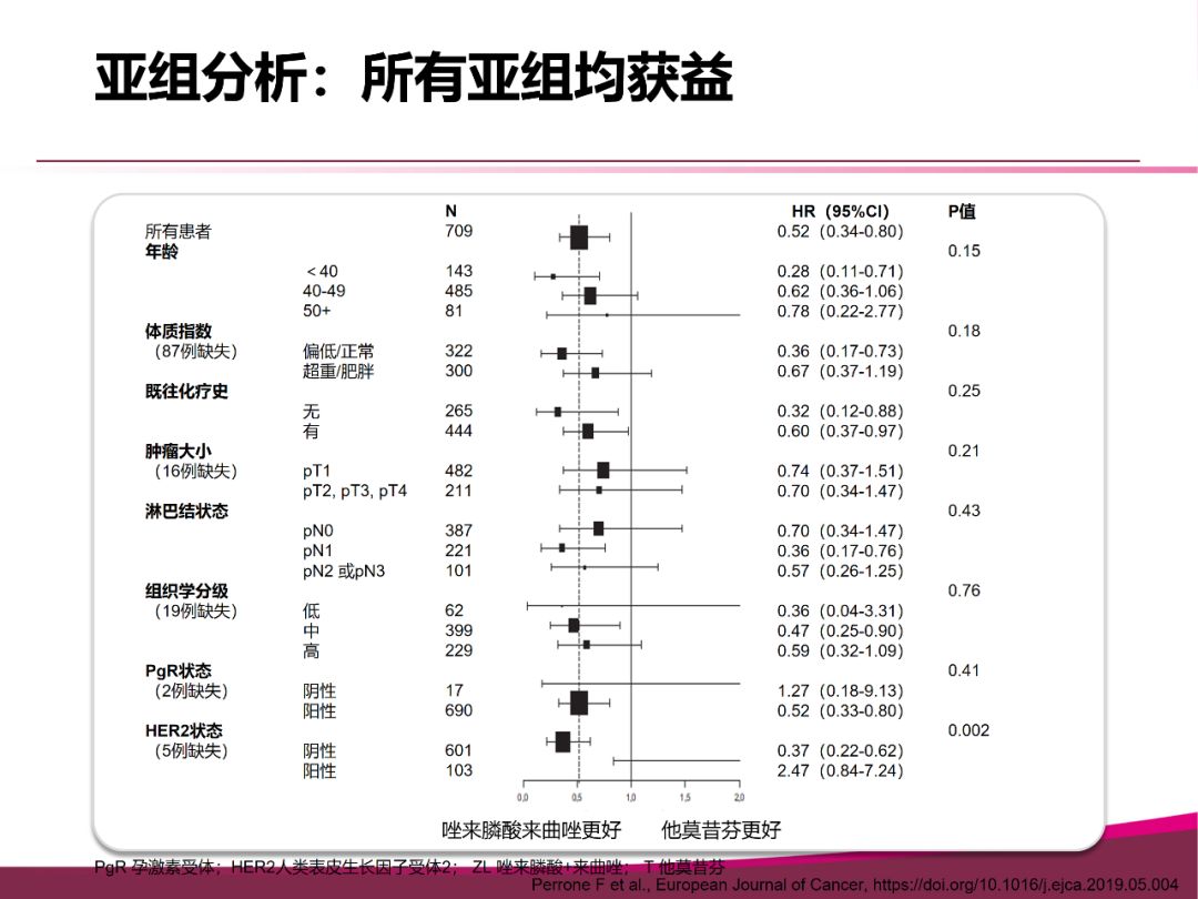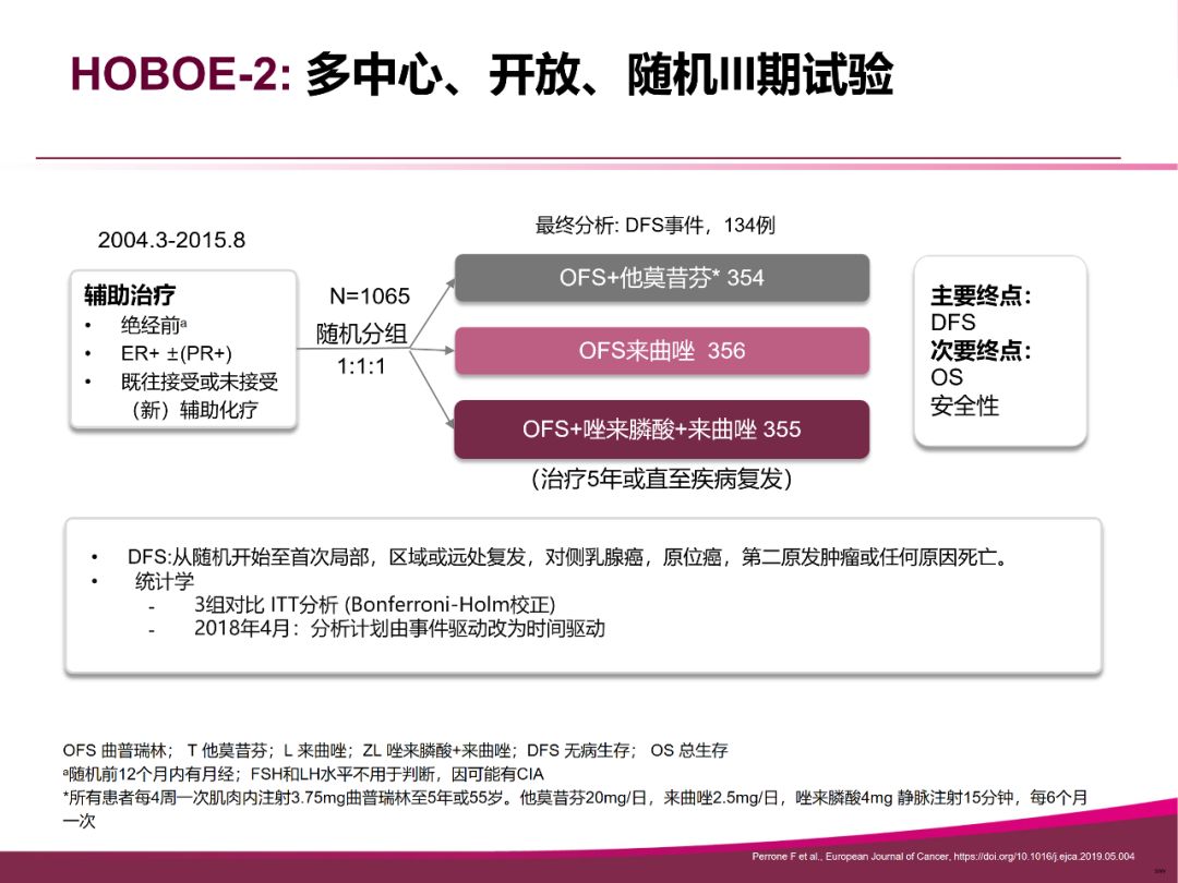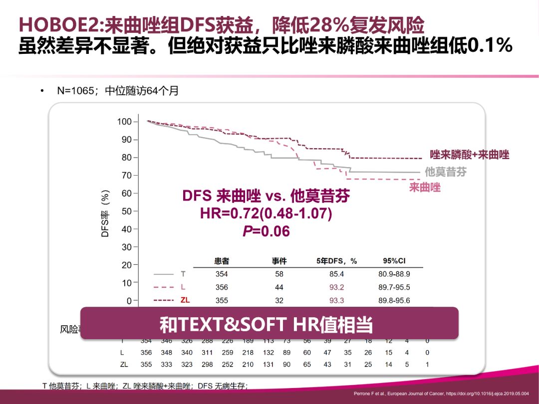 对于HR阳性的年轻患者来说,其预后较年长者差,更需要强有效的内分泌治疗。所以年轻乳腺癌患者的治疗策略也是热点议题。SOFT和ASTRRA研究都证实了TAM基础上联合OFS的价值。2018版OFS共识,对于中高危患者也推荐OFS的应用。而今年刚发表的HOBOE-2研究显示来曲唑组DFS获益,降低28%复发风险;来曲唑对比TAM组的风险比和SOFT&TEXT的AI 对比TAM接近。该研究又进一步为来曲唑的应用提供了证据。