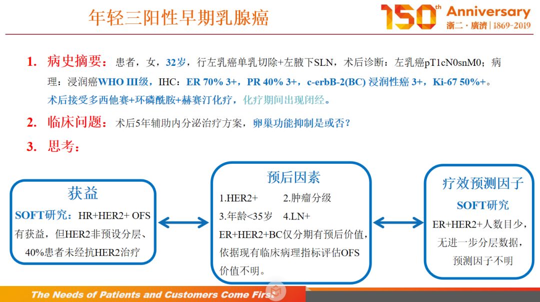 浙江大学医学院附属第二医院乳腺外科的田伟医生介绍的是一例年轻的ER/PR/HER2三阳性患者,并将围绕“ER+ HER2+绝经前乳腺癌患者术后辅助内分泌治疗选择,OFS是否必需?”的问题,从以下四个方面进行分析。(1)OFS获益:SOFT和ASTRRA研究提示HR+绝经前患者OFS获益,而SOFT研究中看到HER2+亚组获益更为显著;这提示对于ER+ HER2+绝经前BC术后辅助OFS有所获益。(2)预后因素:近期回顾性研究均为发现年轻、HER2阳性、肿瘤分级高等因素对ER+HER2+患者具有预后价值,采用上述指标选择OFS获益人群不确切。(3)预测因子:SOFT和ASTRRA研究中HER2+人群较少,无进一步分层及临床转化研究,无法推定HER2+ 人群OFS的疗效预测因子。(3)不良反应:增加OFS3-4度不良反应增加7.6%。可见,特别对于临床中风险的ER+ HER2+患者,OFS仍不可盲目推荐,需平衡利弊。