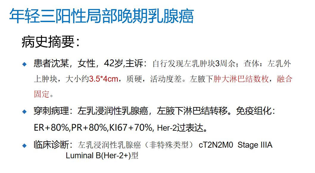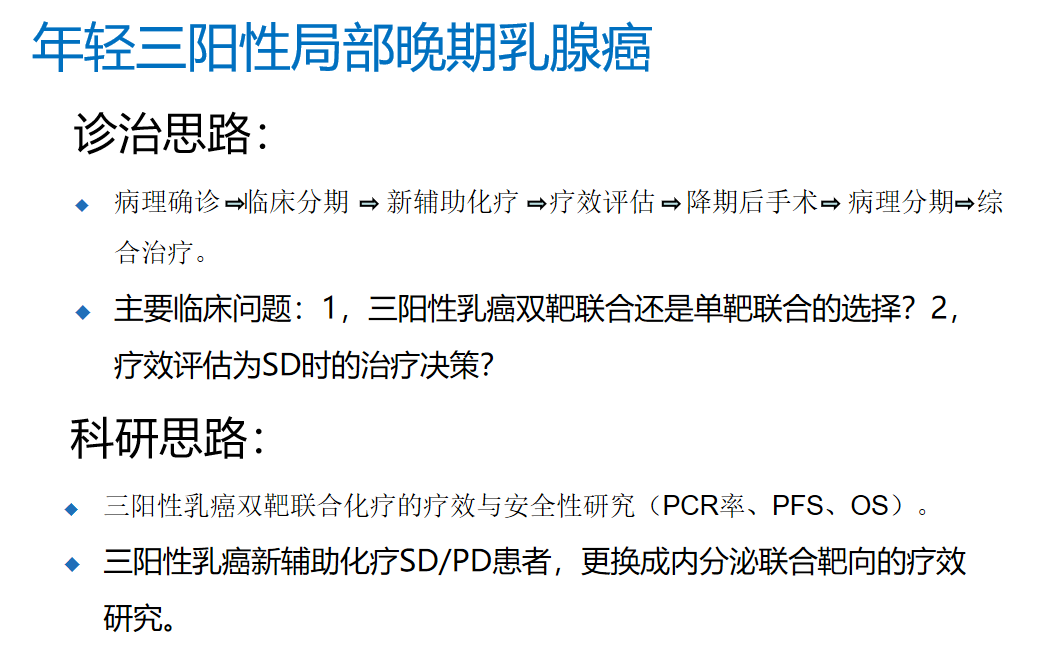 江苏省肿瘤医院乳腺外科李丽医生报告的是一例绝经前ER/PR/HER2三阳性患者,并在临床诊疗过程中提出若干问题:(1)三阳性乳癌双靶联合还是单靶联合的选择?(2)疗效评估为SD时的治疗决策?基于该真实世界案例,李医生产生了以下科研设想何思路:(1)三阳性乳癌双靶联合化疗的疗效与安全性研究(PCR率、PFS、OS);(2)三阳性乳癌新辅助化疗SD/PD患者,更换成内分泌联合靶向的疗效研究。