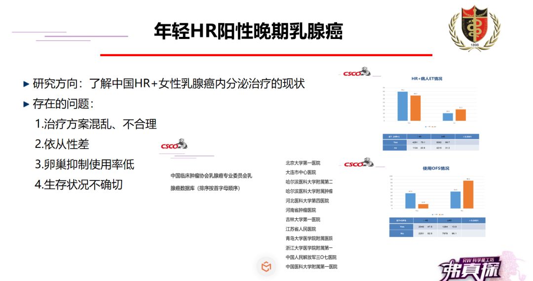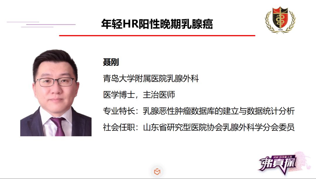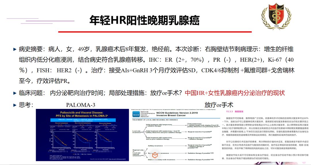 青岛大学附属医院乳腺外科聂刚医生汇报的是一例年轻的HR阳性乳腺癌患者,通过回顾PALOMA-3研究和NCCN指南推荐等循证医学证据,提出了内分泌靶向治疗时间和局部处理措施(放疗or手术?)等问题。聂医生进一步总结中国HR阳性乳腺癌内分泌治疗现状,包括治疗方案混乱、不合理,依从性差,卵巢抑制使用率低和生存状况不确切等,希望通过真实世界数据对这些问题进行回答和补充。