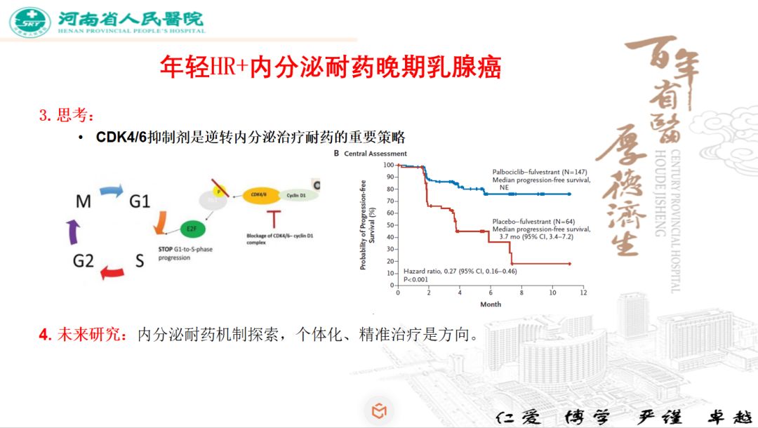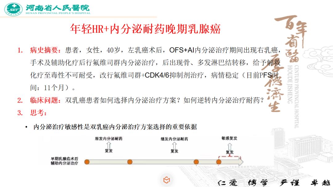 河南省人民医院的邵营波医生分享的是一例年轻HR阳性内分泌耐药的晚期乳腺癌患者,并提出了双乳癌患者如何选择内分泌治疗方案以及如何逆转内分泌治疗耐药等问题。基于内分泌治疗敏感性是双乳癌内分泌治疗方案选择的重要依据,以及CDK4/6抑制剂是逆转内分泌治疗耐药的重要策略等思考,邵医生希望在未来的内分泌耐药机制探索中,能够朝向更加个体化的精准治疗方向发展。