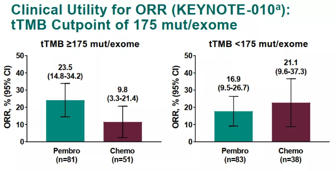 KEYNOTE-010研究中,在tTMB≥175 mut/exome的患者中,帕博利珠单抗组的中位OS为14.1个月,化疗组的中位OS为7.6个月(HR=0.56;95%CI: 0.38~0.83)。两组中位PFS分别为4.2个月和2.4个月(HR=0.59;95%CI: 0.40~0.87);两组ORR分别为23.5%和9.8%。在tTMB<175 mut/exome的患者中,博利珠单抗组和化疗组的中位OS分别为9.3个月和7.2个月(HR=0.85;95%CI: 0.56~1.30),中位PFS分别为3.7个月和3.4个月(HR=1.09;95%CI: 0.72~1.63);ORR分别为16.9%和21.1%。