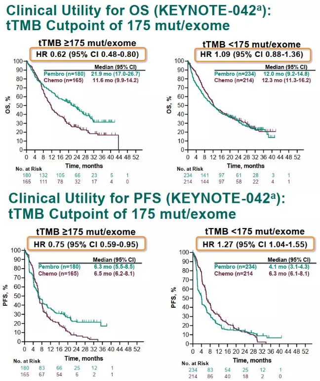 KEYNOTE-042研究中,在tTMB≥175 mut/exome的患者中,帕博利珠单抗组和化疗组的中位OS分别为21.9个月和11.6个月(HR=0.62;95%CI: 0.48~0.80);中位PFS分别为6.3个月和6.5个月(HR=0.75;95%CI: 0.59~0.95);两组的ORR分别为34.4%和30.9%。在tTMB<175 mut/exome的患者中,帕博利珠单抗组和化疗组的中位OS分别为12.0个月和12.3个月(HR=1.09;95%CI: 0.88~1.36);中位PFS分别为4.1个月和6.3个月(HR=1.27;95%CI: 1.04~1.55);两组的ORR分别为18.8%和22.4%。