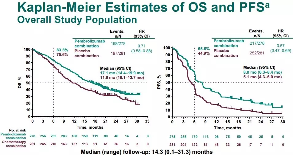 数据 截止2019 年5月9日,中位随访时间为14.3个月。在所有的意向治疗人群中,帕博利珠单抗联合化疗组的中位OS达到17.1个月(14.4~19.9),降低29%的死亡风险(HR=0.71,95%CI:0.58~0.88);而单纯化疗组的OS仅有11.6个月(10.1~13.7)。两组的PFS分别为8.0个月和5.1个月(HR=0.57,95% CI: 0.47-0.69)。