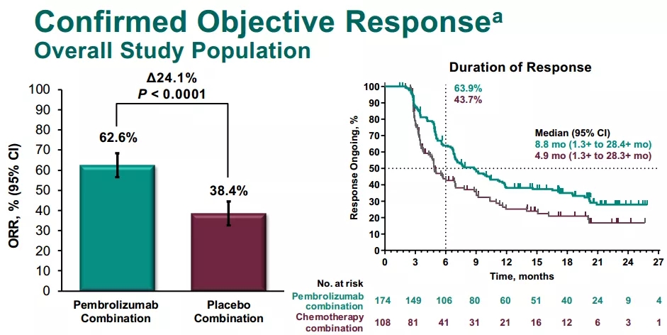 IO+化疗组和单纯化疗组的ORR分别为62.6%和38.4%,提高了24.2%(P<0.0001),DoR分别为8.8个月和4.9个月,达到6个月DoR的患者比例为63.9%和43.7%。