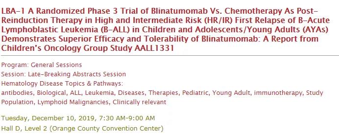 AALL1331研究:中高危儿童、青少年及年轻成人B细胞急淋首次复发后,比较Blinatumomab vs.化疗作为再诱导后巩固方案的疗效和耐受性