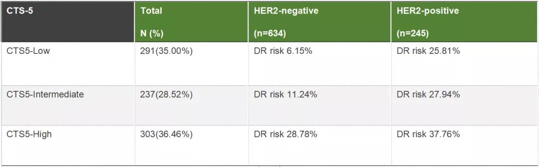 研究结果:该研究中总样本(n=831)和HER2阴性队列(n=634)的连续和分类CTS5评分对晚期远期复发率DR有显著的预后意义。CTS5(基于ATAC/BIG1-98数据)在整个队列中定义为低风险(<5%DR风险,5~10岁)、中风险(5~10%)或高风险(>10%)的风险分层分别包括35.0%的为低风险队列(291/831)、28.52%的为中风险队列(237/831)和36.46%的为高风险队列(303/831)。