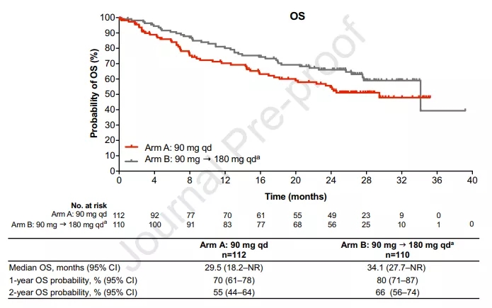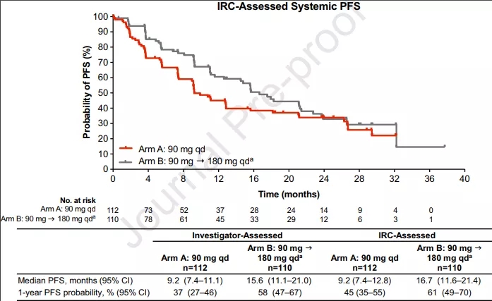 共有222例患者接受随机分组,其中A组和B组分别为112例和110例,两组中位随访时间分别为19.6个月和24.3个月,基线时,两组分别有71%和67%的患者有脑转移。研究者评估的ORR分别为46%和56%,PFS分别为9.2个月和16.7个月,中位OS分别为29.5个月和34.1个月。独立评审委员会评估的颅内ORR分别为50%和67%,颅内缓解持续时间分别为9.4个月和16.6个月,颅内PFS时间分别为12.8个月和18.4个月。对全组队列来说,靶病灶无缩小、缩小1-25%、25-50%、51-75%和76-100%的患者的PFS分别为1.9个月、5.5个月、11.1个月,16.7个月和15.6个月。未发现新的不良反应。
