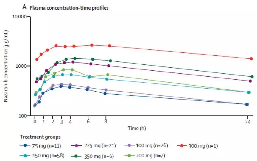 图2. 不同时间及治疗剂量的Nazartinib血药浓度