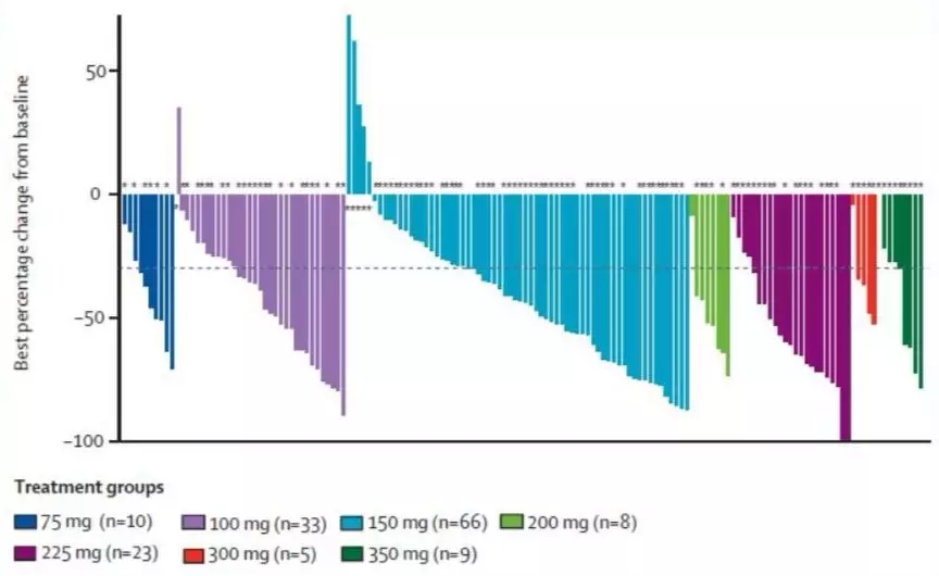 图3. 不同剂量组患者接受治疗的瀑布图