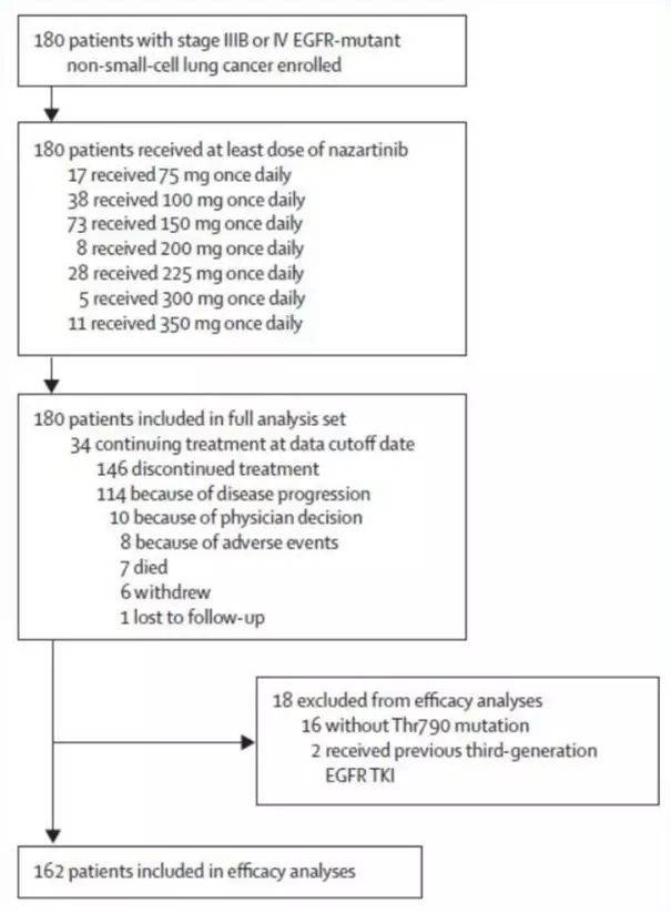 符合入组标准的患者接受Nazartinib的治疗,治疗剂量从75 mg开始,中间设置100 mg、150 mg、200 mg、225 mg、300 mg及350 mg等7个不同剂量组(药物均为口服)。爬坡持续进行,直至出现最大耐受剂量或到达目标剂量。如果疾病进展后,研究者认为患者可以继续从治疗中获益,允许患者继续接受治疗。患者剂量降低的比例不得超过预期剂量的75%。治疗期间每8周进行一次疗效评估。除根据RECIST判断疾病进展外,基线非靶病灶的恶化同样被认为是疾病进展。