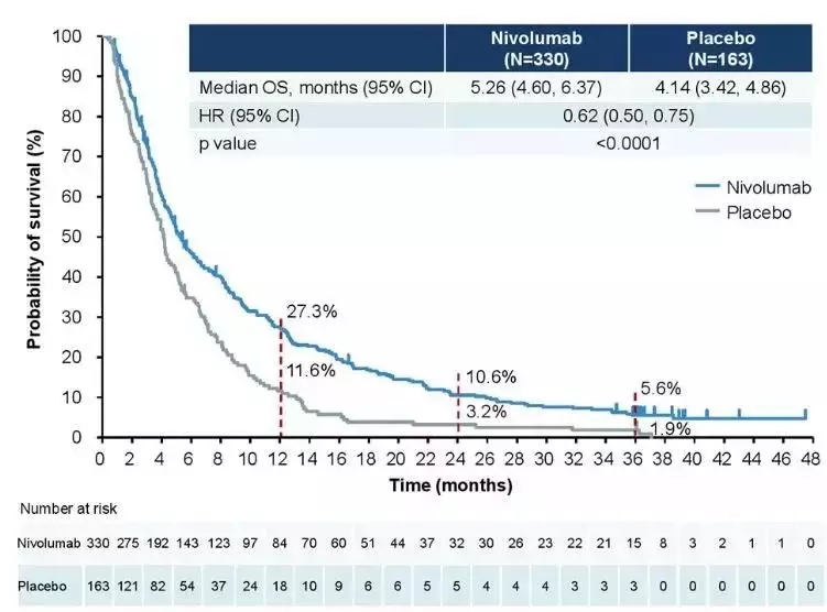 对比安慰剂,纳武利尤单抗三线及后线治疗明显提高总生存(OS)、无进展生存期(PFS)和客观缓解率(ORR)。纳武利尤单抗和安慰剂组的中位OS分别为5.26个月vs 4.14个月[1],纳武利尤单抗组的死亡风险降低38%(HR=0.62,P<0.0001)[1];且无论 PD-L1 表达水平如何,患者均可得到 OS 获益[2]。