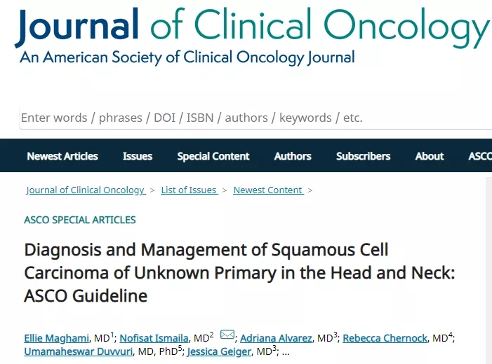 1.Maghami E, Ismaila N., Alvarez A., et al. Diagnosis and Management of Squamous Cell Carcinoma of Unknown Primary in the Head and Neck: ASCO Guideline.?J Clin Oncol. Published April 23, 2020.