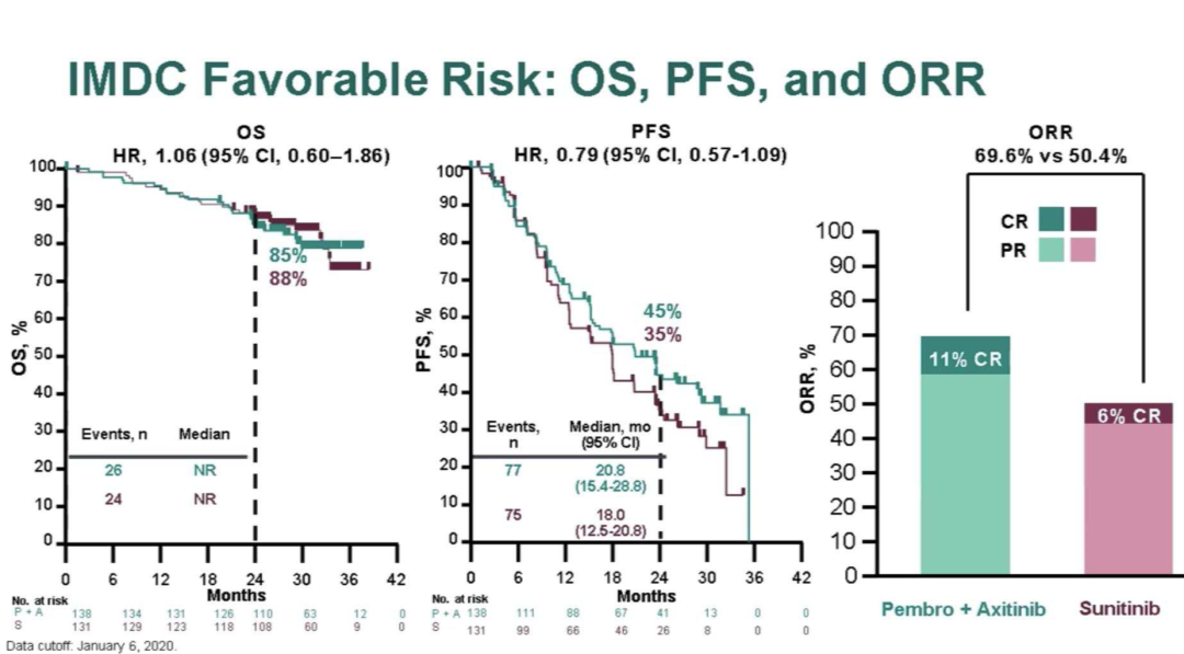 研究结果:患者的中位随访时间为27.0个月(0.1-38.4)。与sunitinib组相比,Pembro+axi组OS得到改善(HR=0.68[95%CI,0.55-0.85];P<0.001;24个月OS率:74% vs 66%)。中位OS(95%CI),Pembro+axi组未达到,sunitinib为35.7个月(33.3-NR)。与sunitinib组相比,Pembro+axi组改善了PFS,(HR=0.71[95%CI,0.60-0.84];P<0.001;24个月PFS率,38% vs 27%)。Pembro+axi组和sunitinib组的中位PFS(95%CI)分别为15.4个月(12.7-18.9)和11.1个月(9.1-12.5);ORR分别为60%和40%(P<0.0001);CR率分别为9%和3%;中位DoR分别为23.5个月(范围1.4+~34.5+)和15.9个月(范围2.3-~31.8+)。