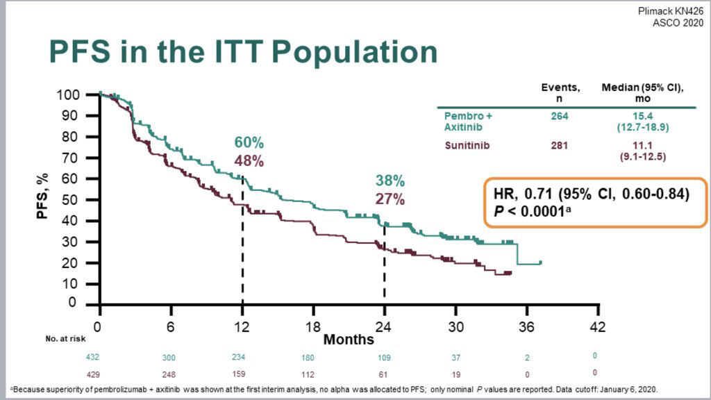 1、PFS: Pembro+axi组和sunitinib组的PFS中值(95%CI)分别为15.4个月(12.7-18.9)和11.1个月(9.1-12.5),联合治疗组可以延长PFS,这种获益最终可能转化为OS优势,同时对于晚期肾癌的治疗,我们希望每种方案能否尽可能延长PFS,达到组合拳的作用。