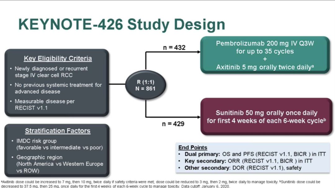 研究方法:该研究共纳入861例接受一线治疗的晚期肾细胞癌患者,Karnofsky表现评分(KPS)≥70%,按1:1比例随机分配Pembrolizumab(200 mg 静脉注射 Q3W,最多35个周期)+axitinib(5mg 口服BID)(n= 432)或sunitinib治疗(50 mg口服QD,连续4周/停药2周)(n= 429),直至疾病进展、不能耐受毒性、研究者和患者决定停药等。按IMDC风险(有利vs中等vs较差)和地理区域(北美vs西欧vs世界其他地区)进行分层。主要终点是OS和PFS,次要终点是ORR、DOR和安全性。随机分组后6个月内,进行探索性分析,以评估客观反应率(目标病灶直径总和从基线最大减少)和OS之间的相关性。