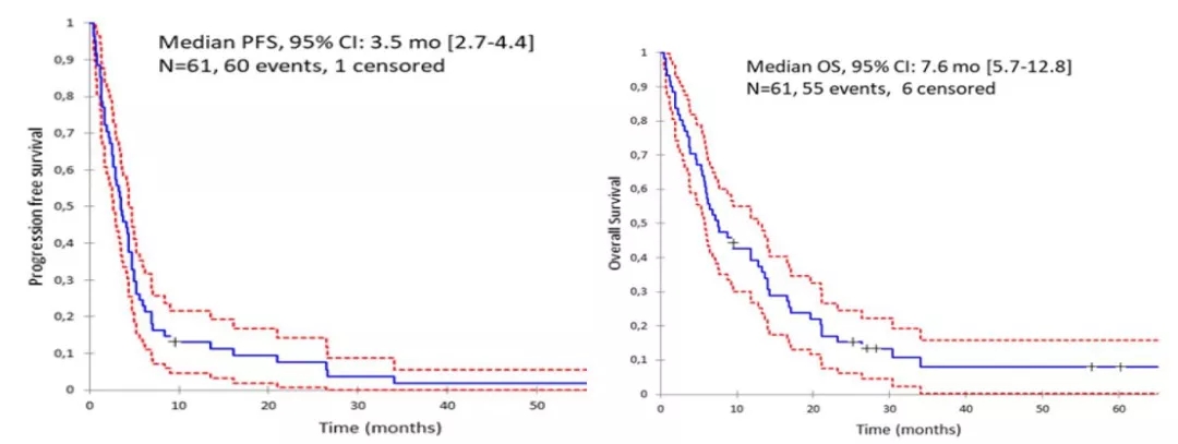 患者12周的DCR率为50.8%,21.3%的患者为PR。中位PFS和OS分别为3.5个月和7.6个月。其中,PS评分为0-1分的患者预后最好,PFS和OS分别为4.3个月和和11.9个月。有脑转移和无脑转移患者的PFS分别为4.0个月和2.6个月,OS分别为11.9和6.2个月。