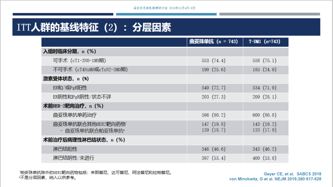 研究设计:研究入组患者为cT1-4/N0-3/M0、经新辅助治疗后仍然有残留病灶的HER2阳性乳腺癌患者,新辅助化疗要求至少6个周期(不少于9w的紫杉醇,允许使用蒽环和烷化剂,化疗均在术前完成),新辅助靶向治疗要求至少曲妥珠单抗9w(允许双靶)。患者术后12w随机分配至T-DM1组(3.6 mg/kg IV Q3W,共14周期)和曲妥珠单抗组(6 mg/kg IV Q3W,共14周期),主要终点为iDFS(预设的最终目标为3年iDFS率从曲妥珠单抗组的70.0%提高至T-DM1组的76.5%,HR 0.75)。研究于2013年4月3日至2015年12月31日共入组了1486例患者(曲妥珠单抗组和T-DM1各743例)。
